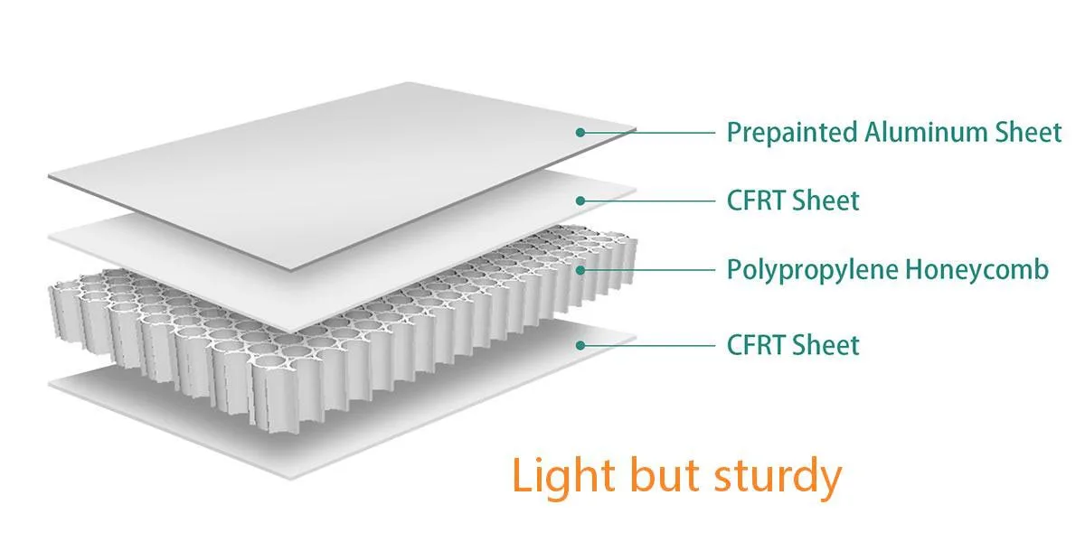 ●Дизајн без скелет: искористувајќи го исклучителниот сооднос цврстина-тежина на саќе панели, го минимизираме или елиминирајте ја внатрешната челична рамка, максимизирајќи го товарниот простор и поедноставувајќи го чистењето.